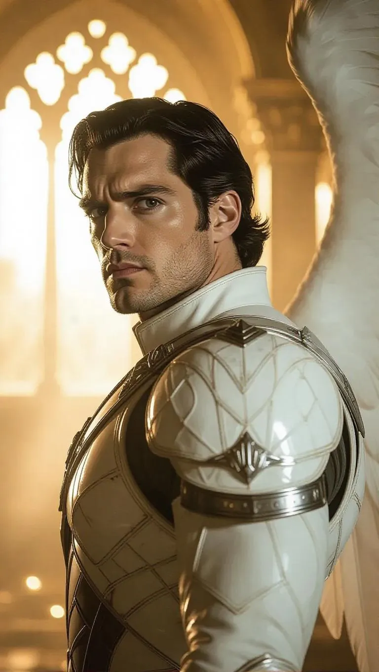 Hyper-realistic AI-generated image of Henry Cavill as Archangel Michael: muscular frame in weathered white tactical gear, intense gaze, massive blurred wings. Cinematic heavenly backdrop with golden halls, divine light shafts, and smoky atmosphere. Perfect for 4K-resolution celestial warrior art, combining hyper-detailed realism and ethereal ambiance. Ideal for AI art enthusiasts seeking divine aesthetics.