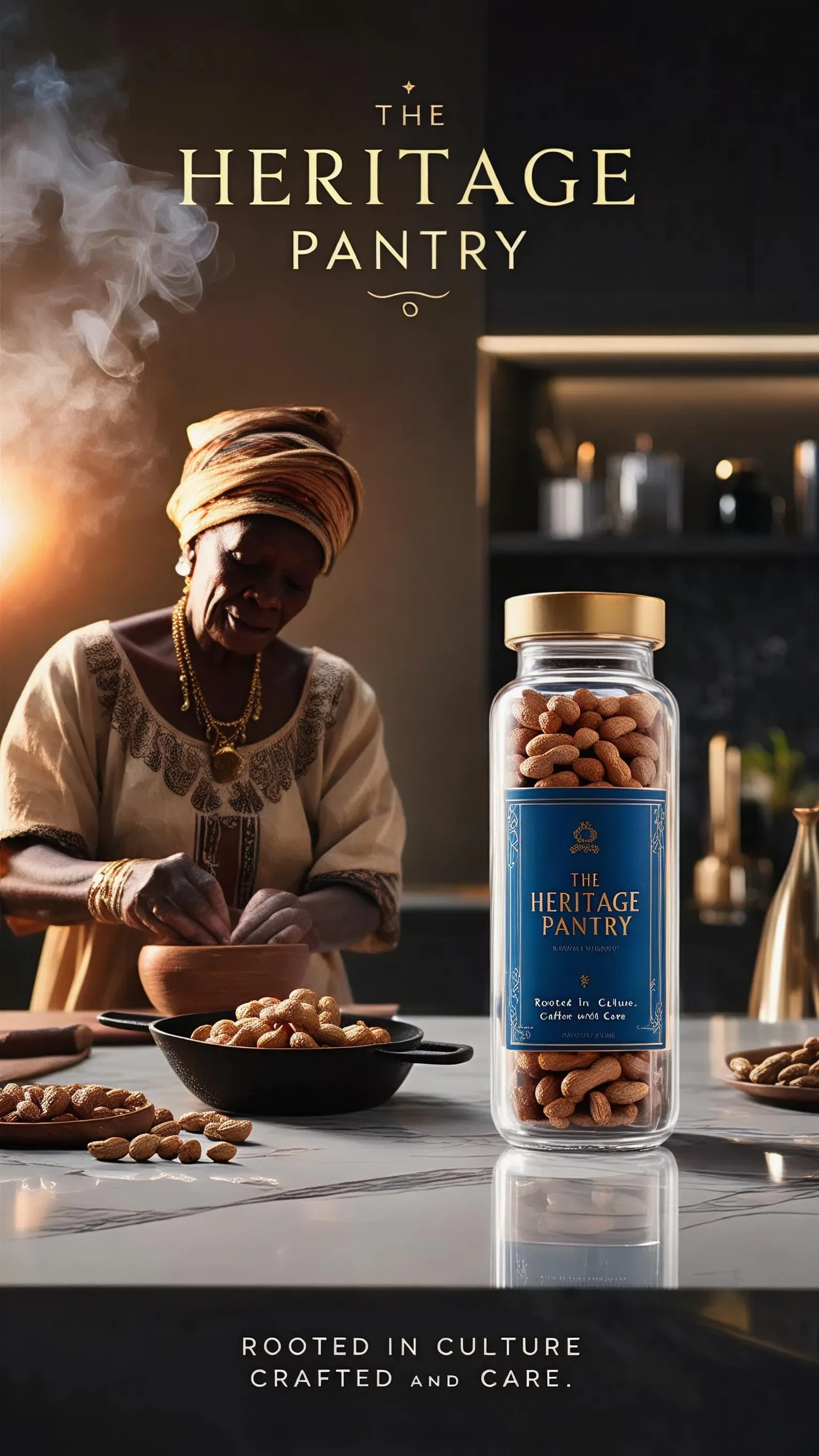 Generate stunning AI visuals for "The Heritage Pantry" luxury food brand. Experience cinematic African heritage scenes transitioning to modern kitchens. Showcase premium snack bottles with dramatic lighting, ultra-realistic 4K detail, and elegant gold text. Perfect for high-end social media campaigns and commercial photography. Create vertical, cinematic brand visuals with vivago.ai.