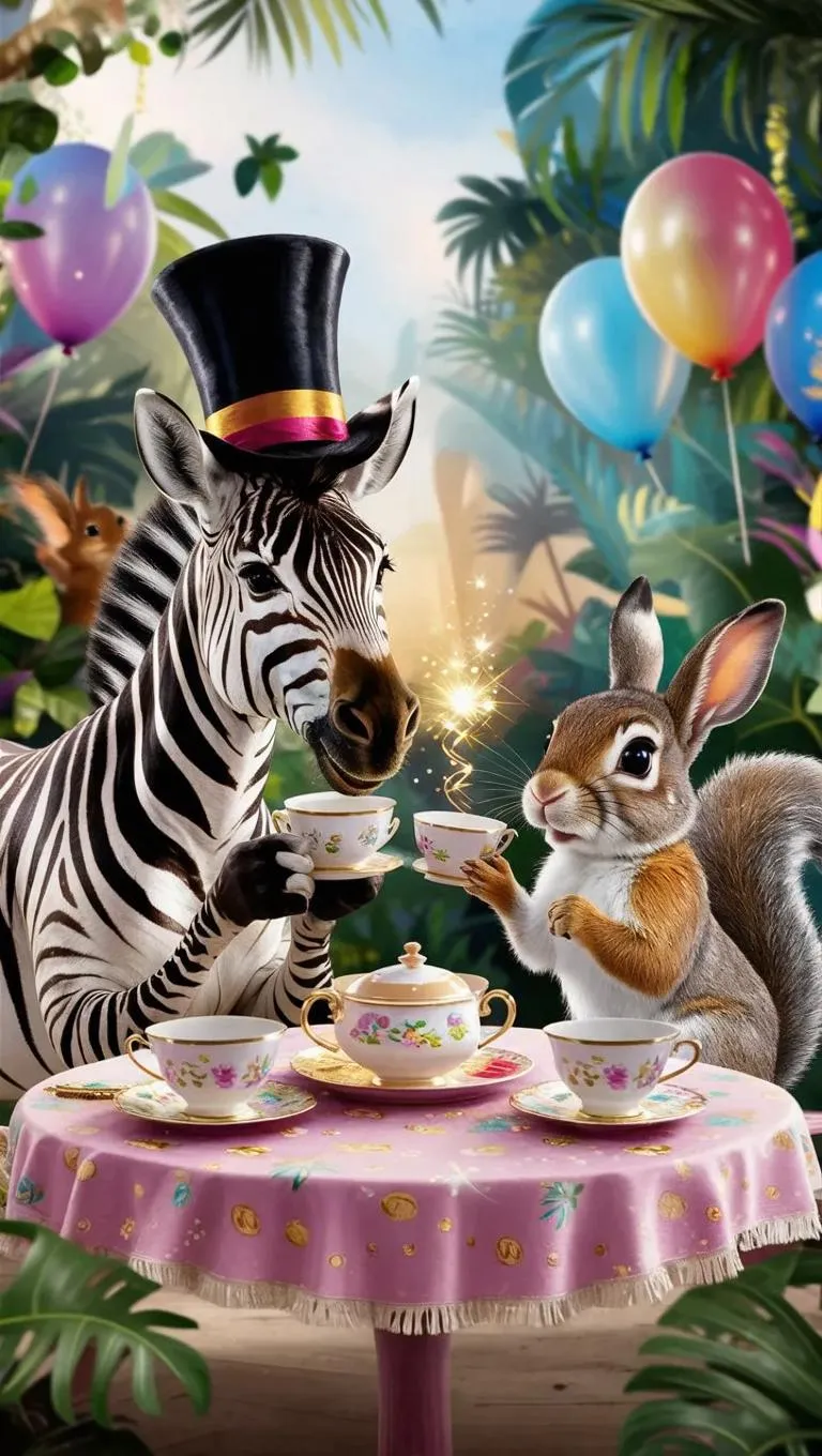 Generate a whimsical AI image of a festive baby zebra, rabbit, and squirrel sharing tea amid vibrant jungle flora. Explore playful camaraderie with colorful balloons, teacups, and lush greenery in this imaginative, exotic scene—crafted effortlessly using VivaGo.ai's AI art tools.