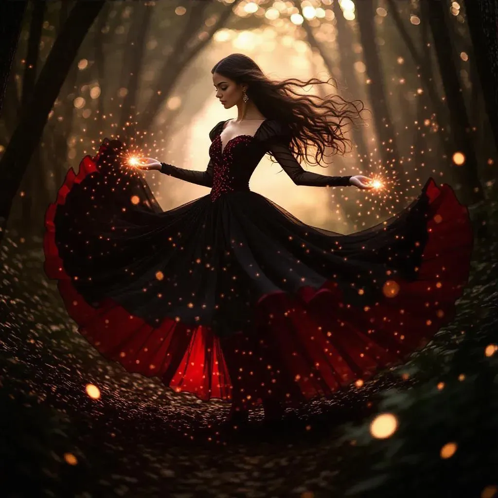 Transform text into enchanting visuals with vivago.ai's AI image generator. Craft a mystical scene: a teen female in a flowing black-red dress, radiating magical energy amid glowing flora, ethereal lights, and shimmering particles in an enchanted forest. Elevate fantasy art with AI-powered effects for professional, otherworldly character designs and dynamic storytelling visuals.