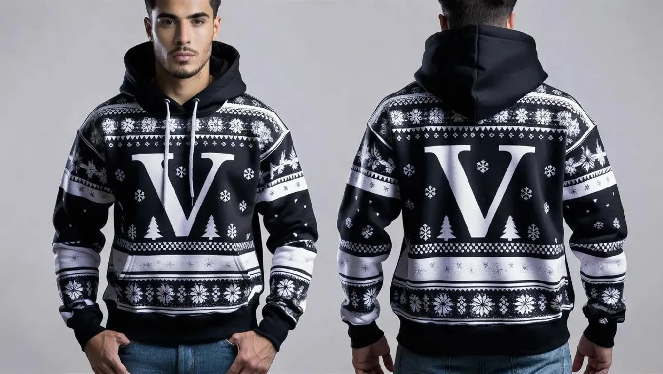 Generate a striking black and white Lui V Xmas designer hoodie with AI-powered creativity. Explore festive AI effects for bold, minimalist streetwear designs. Perfect for seasonal fashion, this AI-generated apparel merges edgy graphics with holiday spirit, offering unique patterns for custom winterwear. Elevate your wardrobe with avant-garde, monochrome Christmas-themed styles.