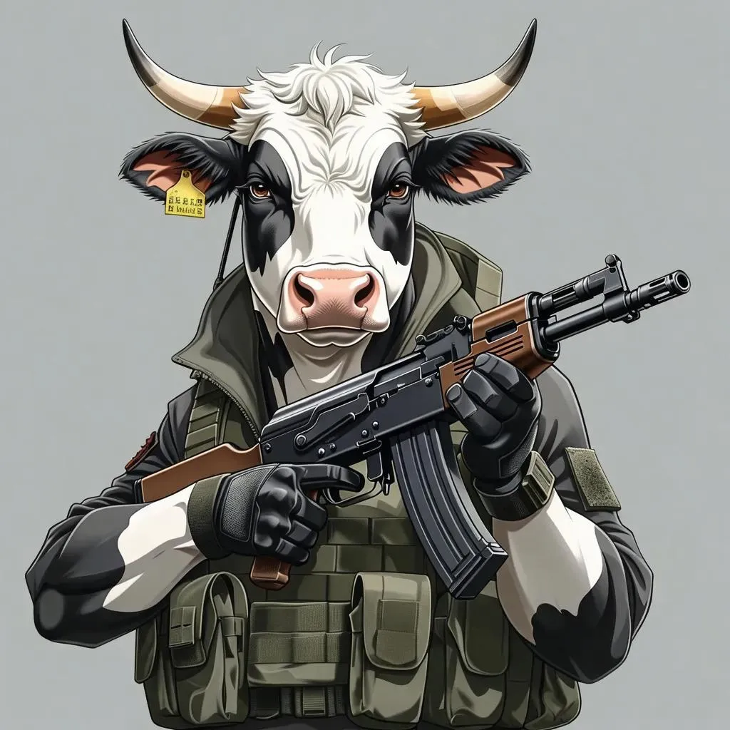 Generate dynamic AI anime art of a cow wielding an AK-47 against a sleek gray backdrop. VivaGo.ai turns text prompts into vivid, high-quality visuals with AI effects, perfect for edgy character designs and striking, surreal scenes. Elevate creativity with professional-grade image generation tools.