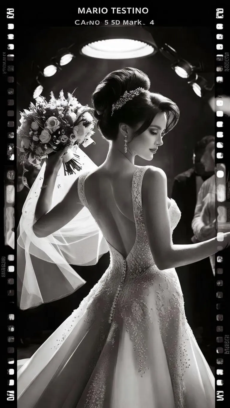 Experience timeless sophistication with this AI-generated black and white wedding photo. Captured in Mario Testino's cinematic style, it features a dark-haired bride elegantly tossing her bouquet, shot on Canon 5D Mark IV. Dramatic lighting, grainy film texture, and meticulous details evoke award-winning artistry, blending vintage charm and modern elegance in a striking monochrome masterpiece perfect for creative storytelling.