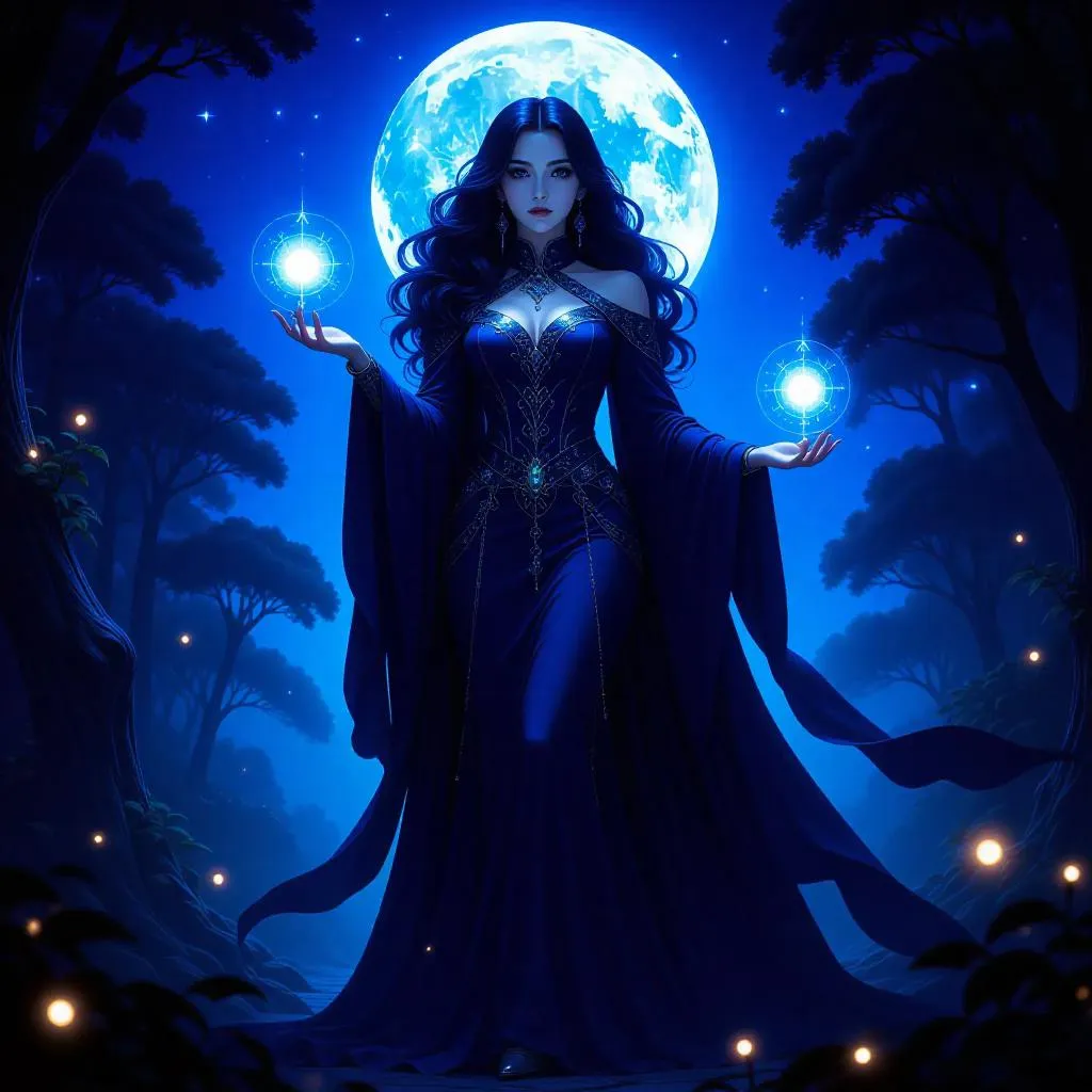 Ethereal fantasy realm woman, adorned in flowing, enchanted robes, standing amidst a mystical forest, surrounded by glowing orbs of light, with a crescent moon and twinkling stars above, casting an otherworldly glow, her hair cascading like silk, eyes shimmering with ancient wisdom.