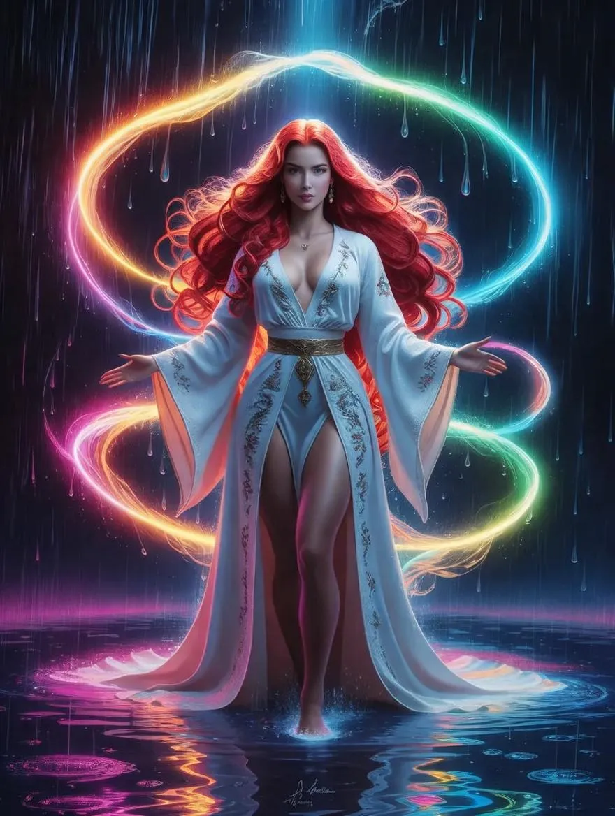 Vivago.ai transforms text into vivid AI art: a fiery-haired sorceress in embroidered white robes stands resilient under neon rain, radiating chromatic auras. Bold hues reflect in vibrant puddles, blending magic and motion. Create mesmerizing visuals with AI-powered precision for dynamic storytelling, saturated colors, and professional-grade surreal imagery. Elevate your creative projects with cutting-edge AI effects and seamless editing tools.