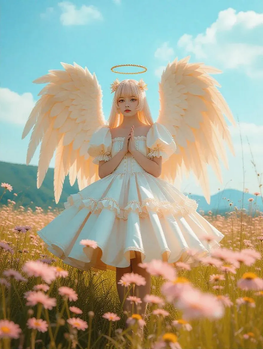 synthetic angel Yungoos with light-brown yellow-tan and pale-pink color palette in the fields