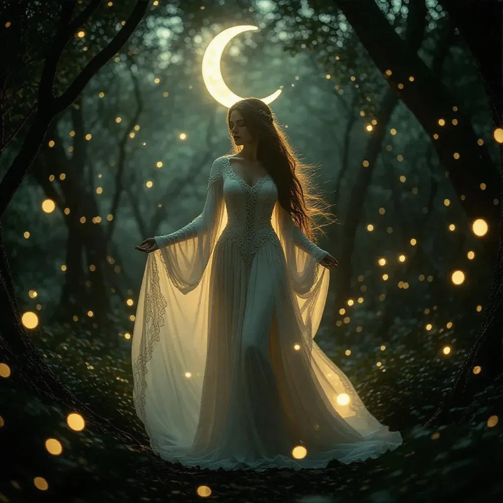 Ethereal fantasy realm woman, adorned in flowing, enchanted robes, standing amidst a mystical forest, surrounded by glowing orbs of light, with a crescent moon and twinkling stars above, casting an otherworldly glow, her hair cascading like silk, eyes shimmering with ancient wisdom.