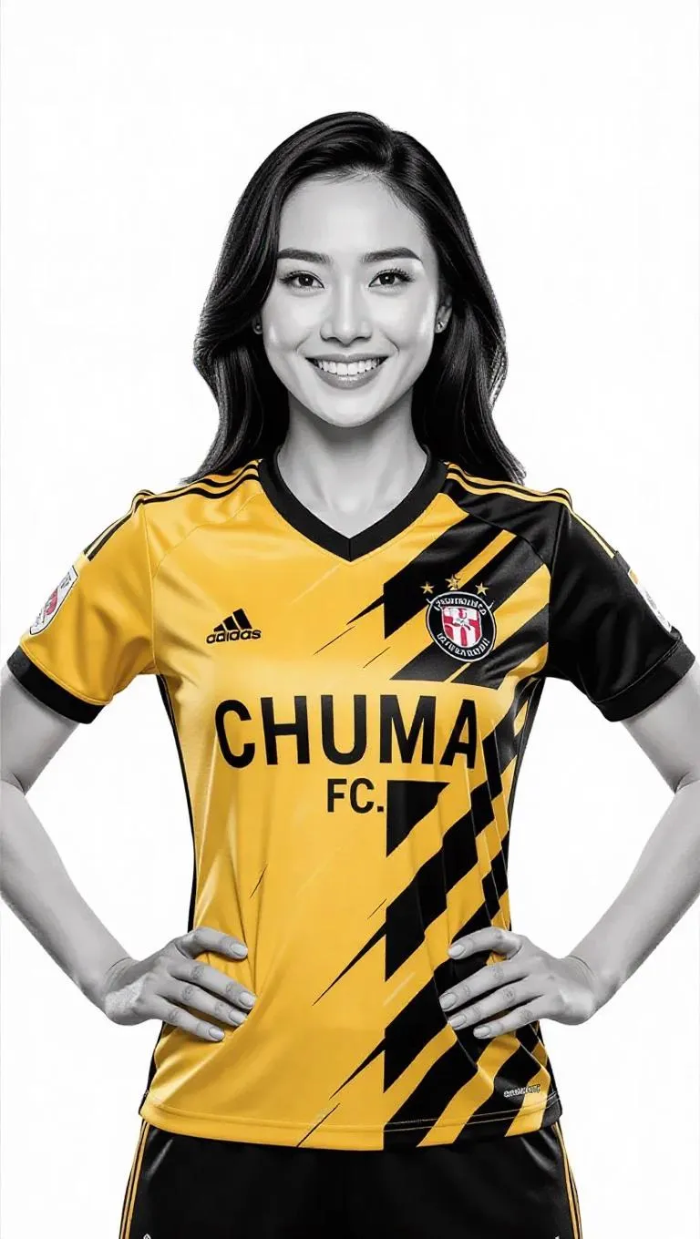 Create stunning AI-generated images of a Vietnamese woman in a vibrant yellow and black CHUMA FC soccer jersey. Elevate team pride with dynamic, digitally enhanced half-body portraits and custom soccer kit designs using advanced AI tools.