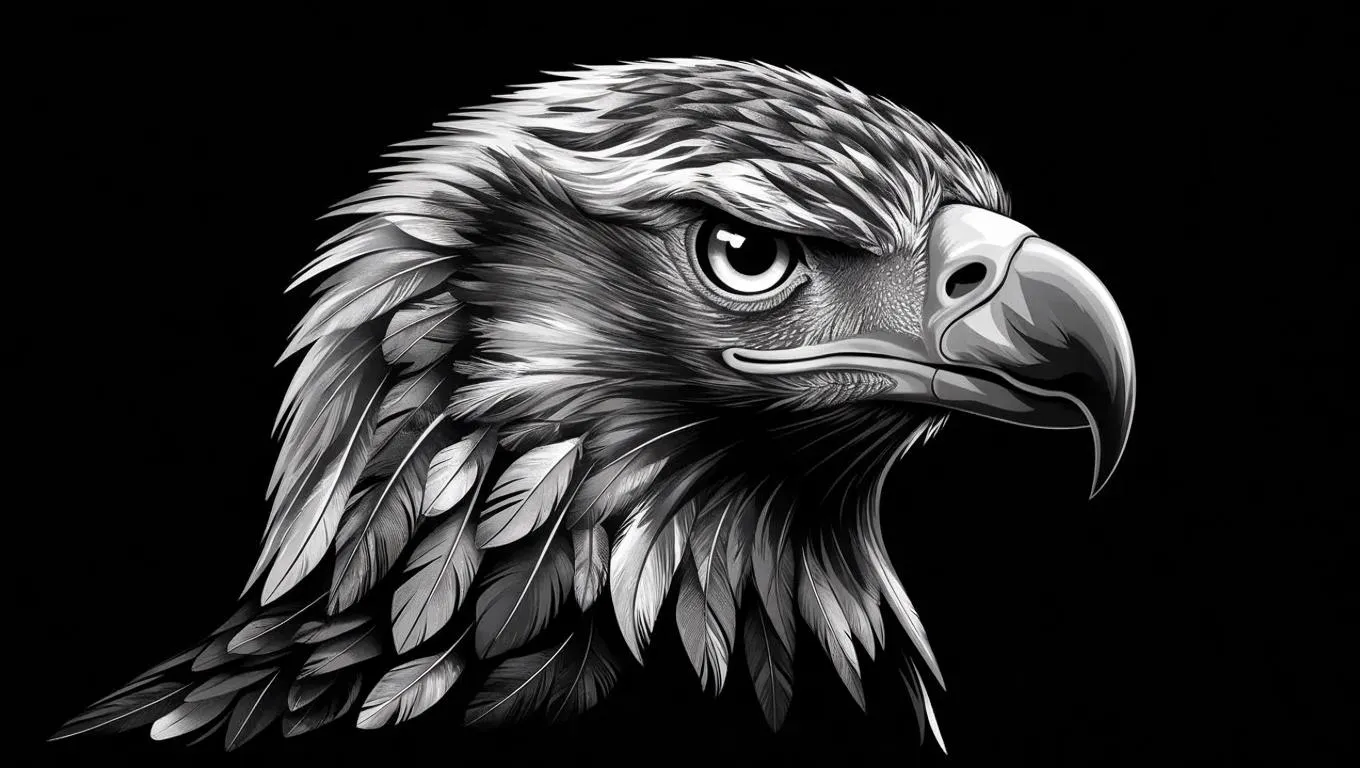 Create a striking black-and-white eagle illustration in tribal-inspired side profile. Features bold lines, sharp beak, fierce eye, and detailed feather textures. Perfect for heraldic symbols, graphic design projects, or monochrome decor. AI-powered tools enhance high-contrast vector art of this majestic raptor, blending tribal motifs with modern graphic style.