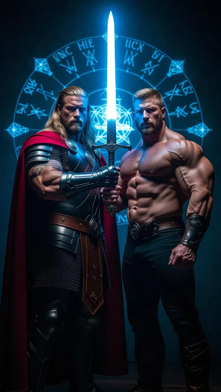 King Arthur, wielding a glowing Excalibur, casts powerful magick spells, surrounded by mystical runes and ethereal light. Jay Cutler, a ginger muscle bodybuilder, stands confidently beside him, exuding strength and determination, both heroes ready for an epic quest.