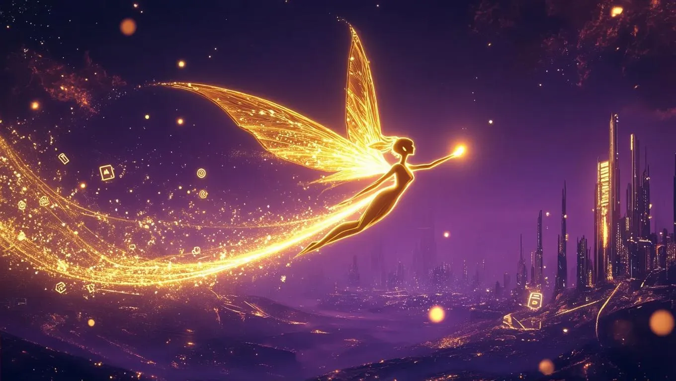 Create AI-generated fantasy landscapes with glowing golden fairies soaring through magical tech realms. Transform text prompts into cinematic visuals featuring deep purple and gold palettes, abstract app icon trails, futuristic cities, and shimmering particles. Perfect symmetrical compositions with ambient glows for professional digital art, video projects, and immersive storytelling using Vivago.ai's advanced image generation tools.