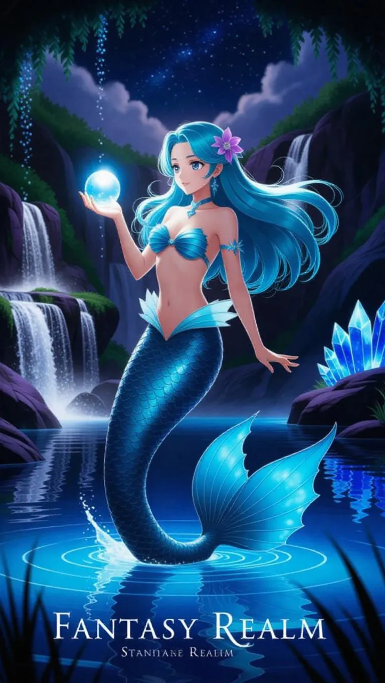 Design an enchanting anime-style scene for the theme 'Fantasy Realm,' featuring a stunning mermaid sorceress with flowing aquamarine hair and shimmering scales on her tail. She rises gracefully from a crystal-clear lake, clutching a luminous pearl orb that emits a soft blue glow, casting a spell. The backdrop showcases sparkling waterfalls, glowing crystals, and a starry night sky, emphasizing her ethereal beauty and magical aura.