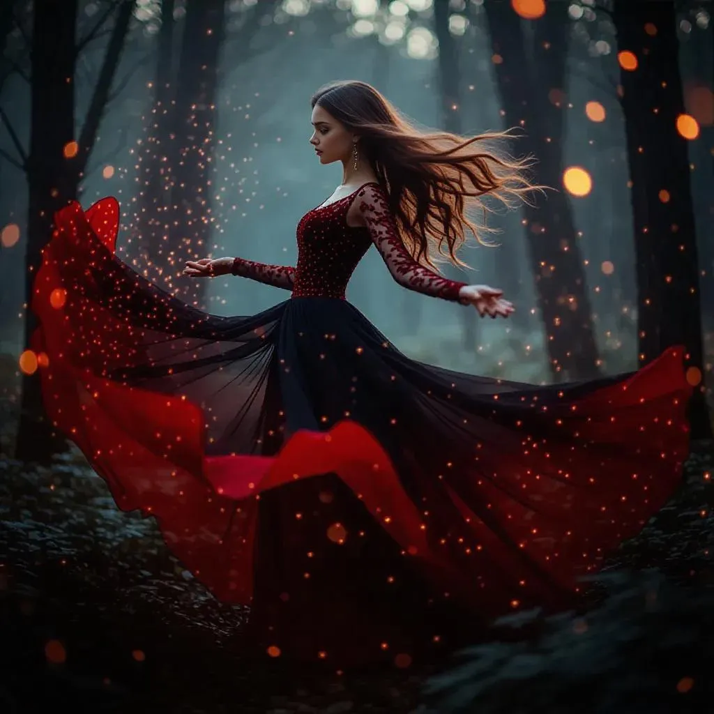 Transform text into enchanting visuals with vivago.ai's AI image generator. Craft a mystical scene: a teen female in a flowing black-red dress, radiating magical energy amid glowing flora, ethereal lights, and shimmering particles in an enchanted forest. Elevate fantasy art with AI-powered effects for professional, otherworldly character designs and dynamic storytelling visuals.
