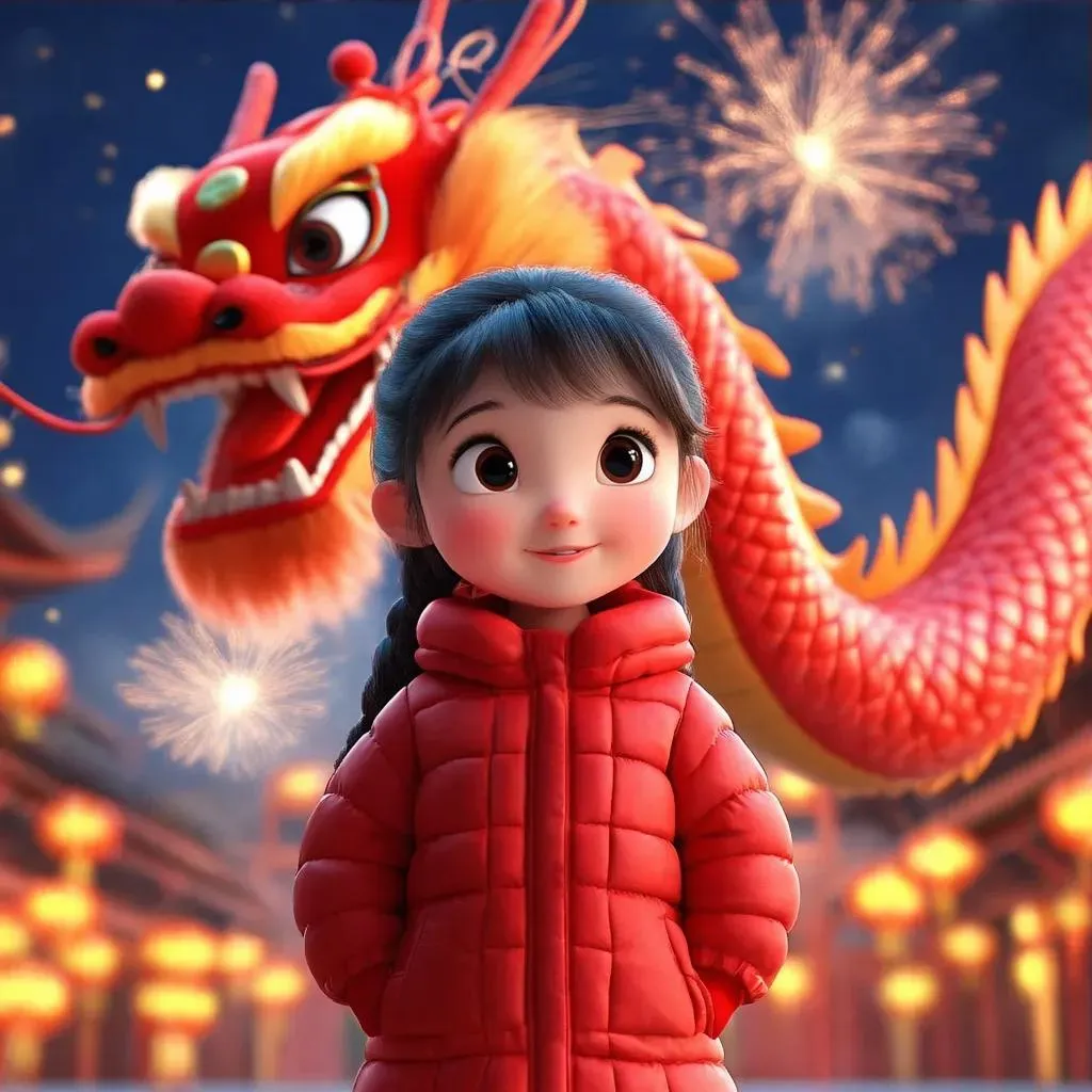 Generate vibrant 3D cartoon scenes featuring a cheerful Chinese girl in a red jacket beside a festive Loong dragon doll during Spring Festival. AI tools craft lively fireworks, vivid colors, and joyful celebrations for dynamic, culturally rich digital art. Perfect for festive storytelling and vibrant visual projects.