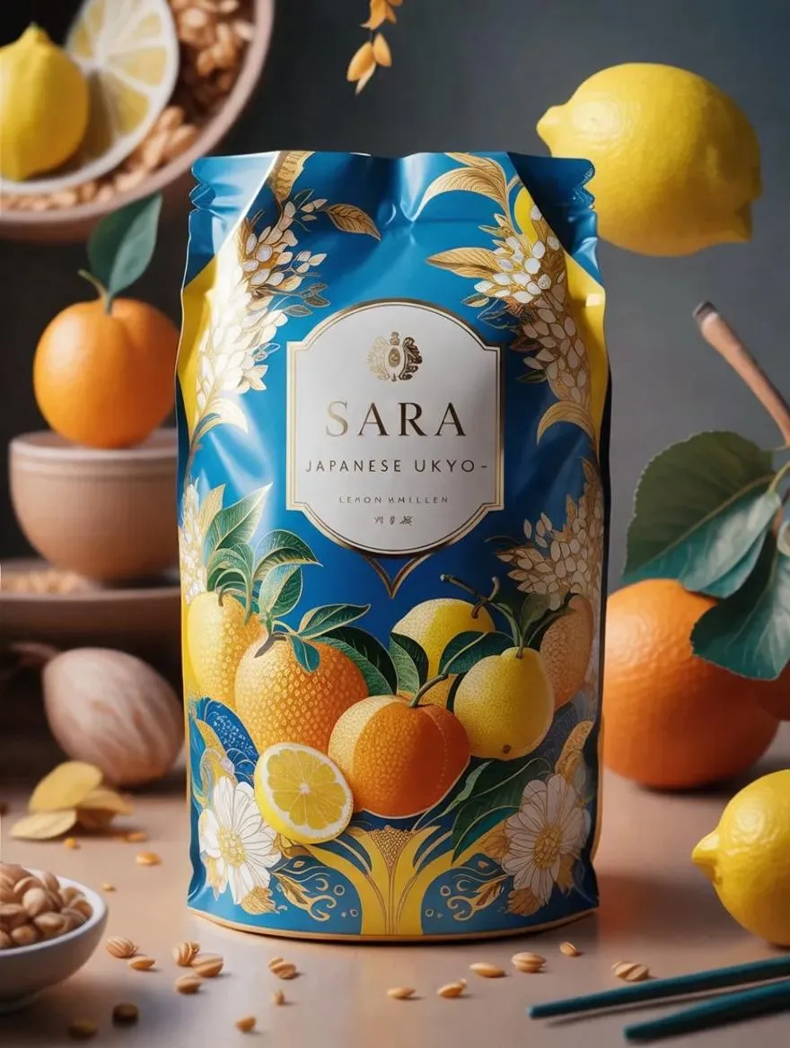 Elevate your millet packaging with Sara's AI-generated designs blending Japanese Ukiyo-e art and Cloisonne Blue aesthetics. Vibrant Lemon Yellow and Bright Orange hues meet fresh fruit motifs for eye-catching, culturally rich packaging. Optimize shelf appeal with AI-curated patterns balancing traditional elegance and modern vibrancy.