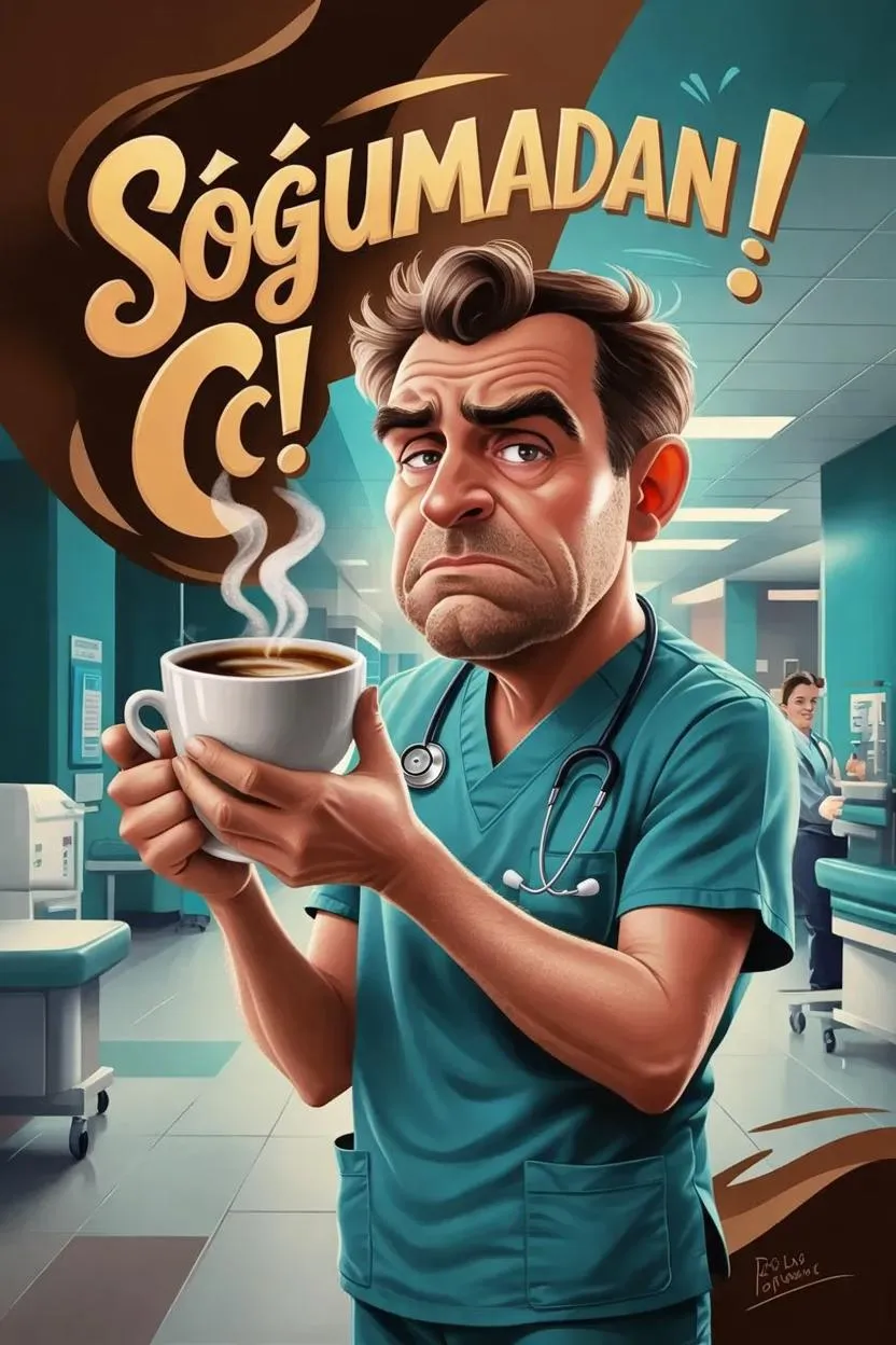 Create a lively AI-generated image of an overworked doctor clutching a steaming coffee cup with "Soğumadan İç!" in bold, cartoonish typography. Perfect for medical humor visuals, blending coffee-brown and teal tones, stethoscope details, and energetic design. Ideal for AI text-to-image tools, memes, or clinic-themed content. Explore vivago.ai's AI effects for professional, eye-catching creative projects.