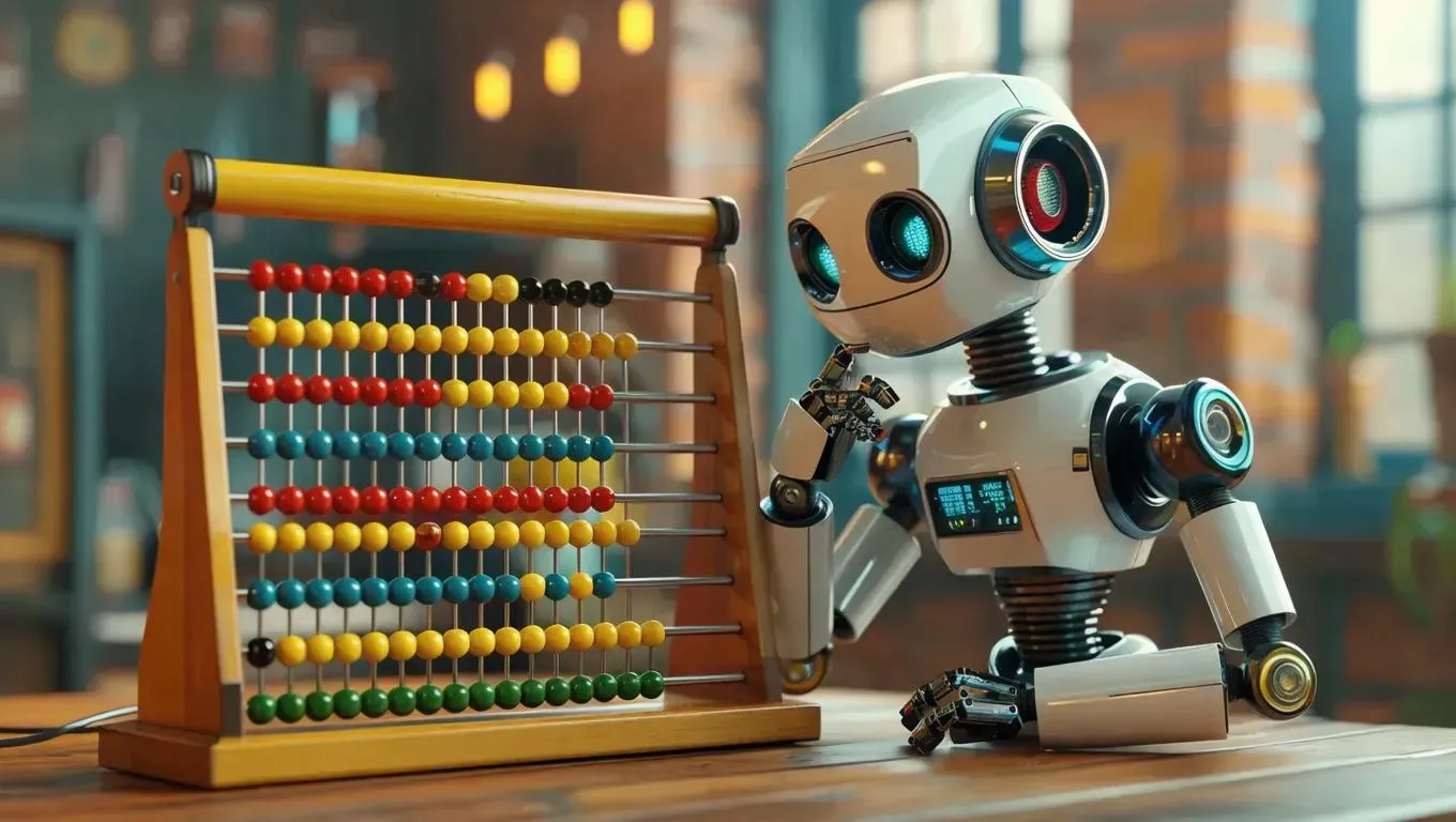 Generate an AI-powered cartoon robot image with a thinking pose, using an abacus in a horizontal layout. Optimized for high-resolution (1800px+ wide) output, blending playful AI animation and detailed calculation themes. Perfect for digital art, presentations, or storytelling. Create vivid visuals with Vivago.ai's creative AI tools for professional-grade cartoon illustrations.