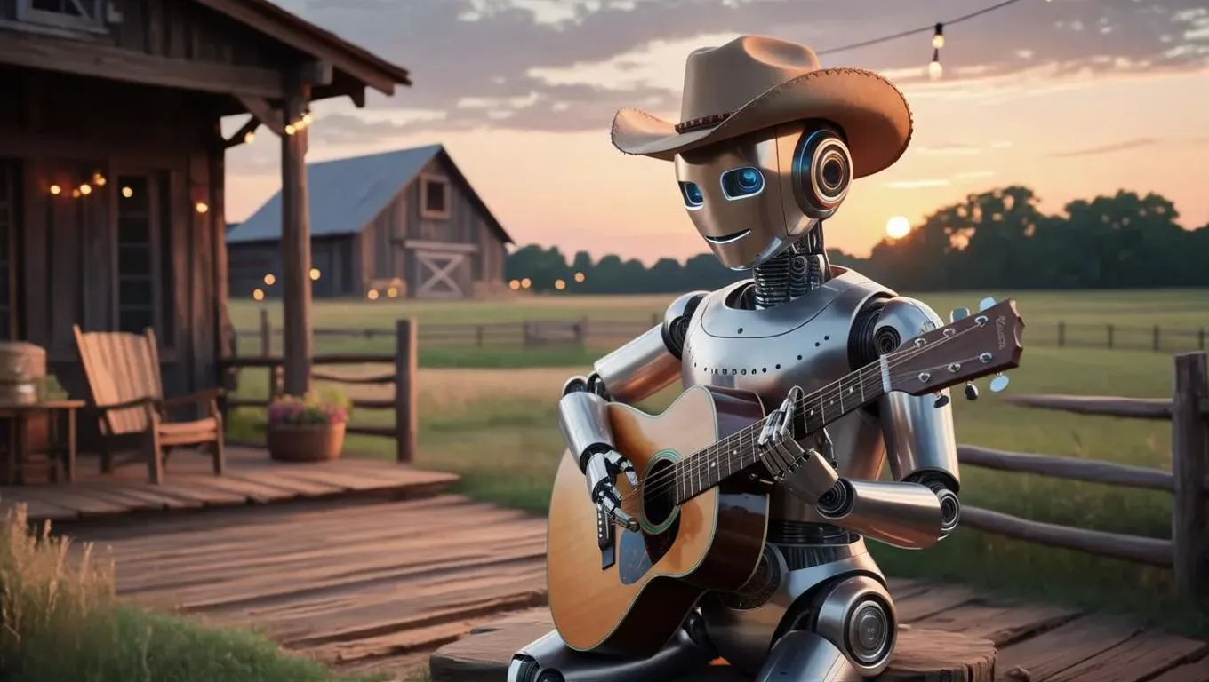 Experience a unique fusion of futuristic AI technology and classic country charm with this AI-generated scene. A sleek robot in a cowboy hat strums an acoustic guitar on a rustic wooden porch at sunset, surrounded by nature, barns, and glowing string lights. Contrasting metallic design with warm, inviting country vibes for creative, eye-catching visual storytelling.