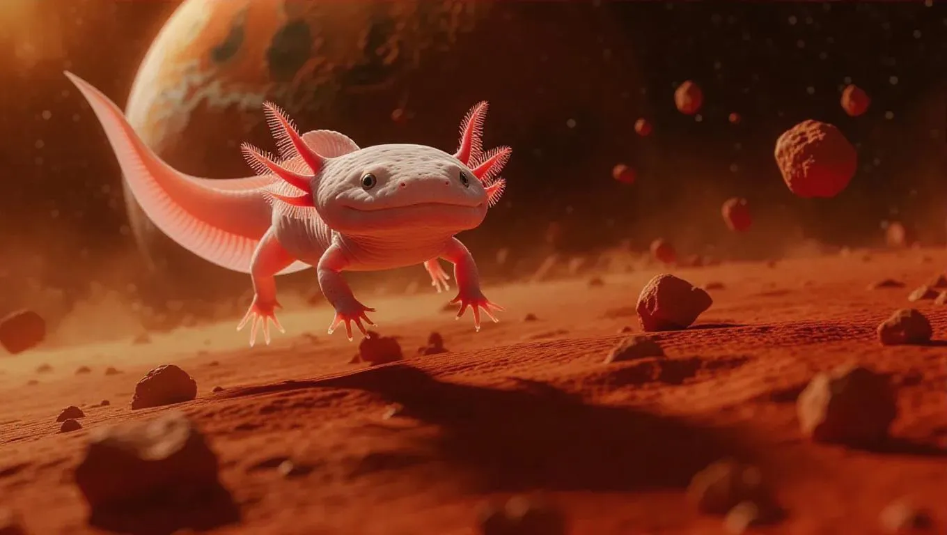 Create AI-generated art of a curious axolotl exploring space with Mars' glowing craters and dust storms. VivaGo AI transforms text prompts into vibrant visuals, blending whimsical details like waving paws and floating Martian rocks. Craft professional, surreal imagery effortlessly with advanced AI tools for stunning cosmic and aquatic creativity.
