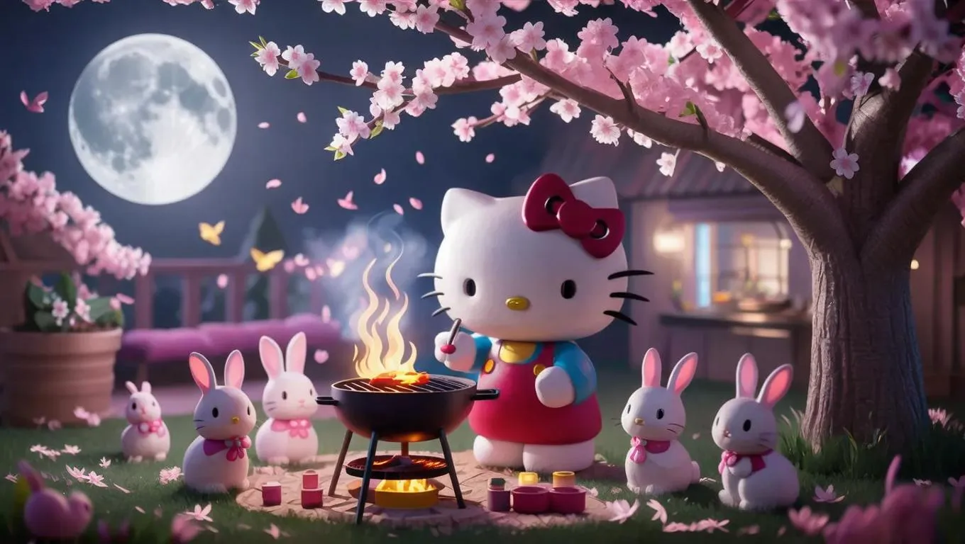 Explore a 3D scene of Hello Kitty's BBQ under cherry blossoms at full moon with cute bunnies. Morandi tones blend with Cyberpunk vibes in this bird's-eye view, enriched by indoor lighting for warmth. AI-generated joy merges whimsy and futurism, crafting a dreamy, cozy atmosphere in vivid detail.