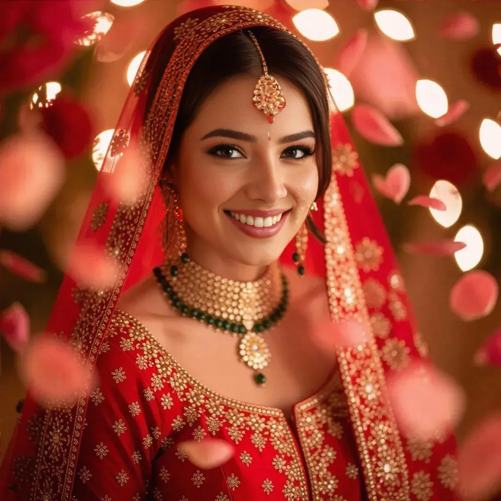 Create a stunning Muslim bridal look with vivago.ai's AI tools. Generate radiant bridal visuals in a vibrant red lehenga, intricate embroidery, and full traditional makeup. Perfect for wedding content, our AI crafts professional-grade, culturally rich designs with flawless details for your special moments.