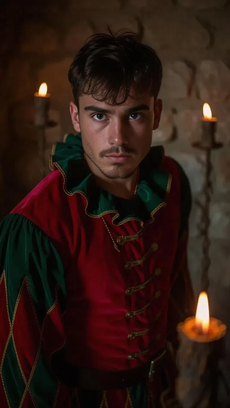 Generate an AI image of a distressed young man in medieval jester attire (red/green) with a short dark beard, contorted on a castle stone floor. Torchlight sets the mood. Create compelling medieval scenes with Vivgo.ai's creative AI image generation. (50 words)