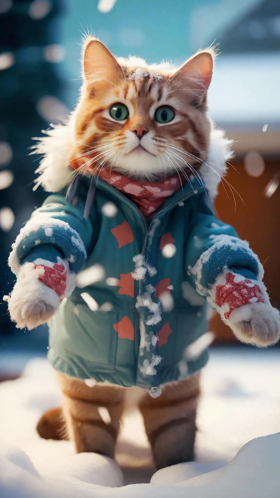 Generate an AI 3D cat wearing snow clothes standing upright in a winter wonderland. Create anthropomorphic snow cat designs with realistic textures and dynamic poses using advanced AI image generation tools. Perfect for holiday themes, character art, and whimsical winter storytelling visuals.