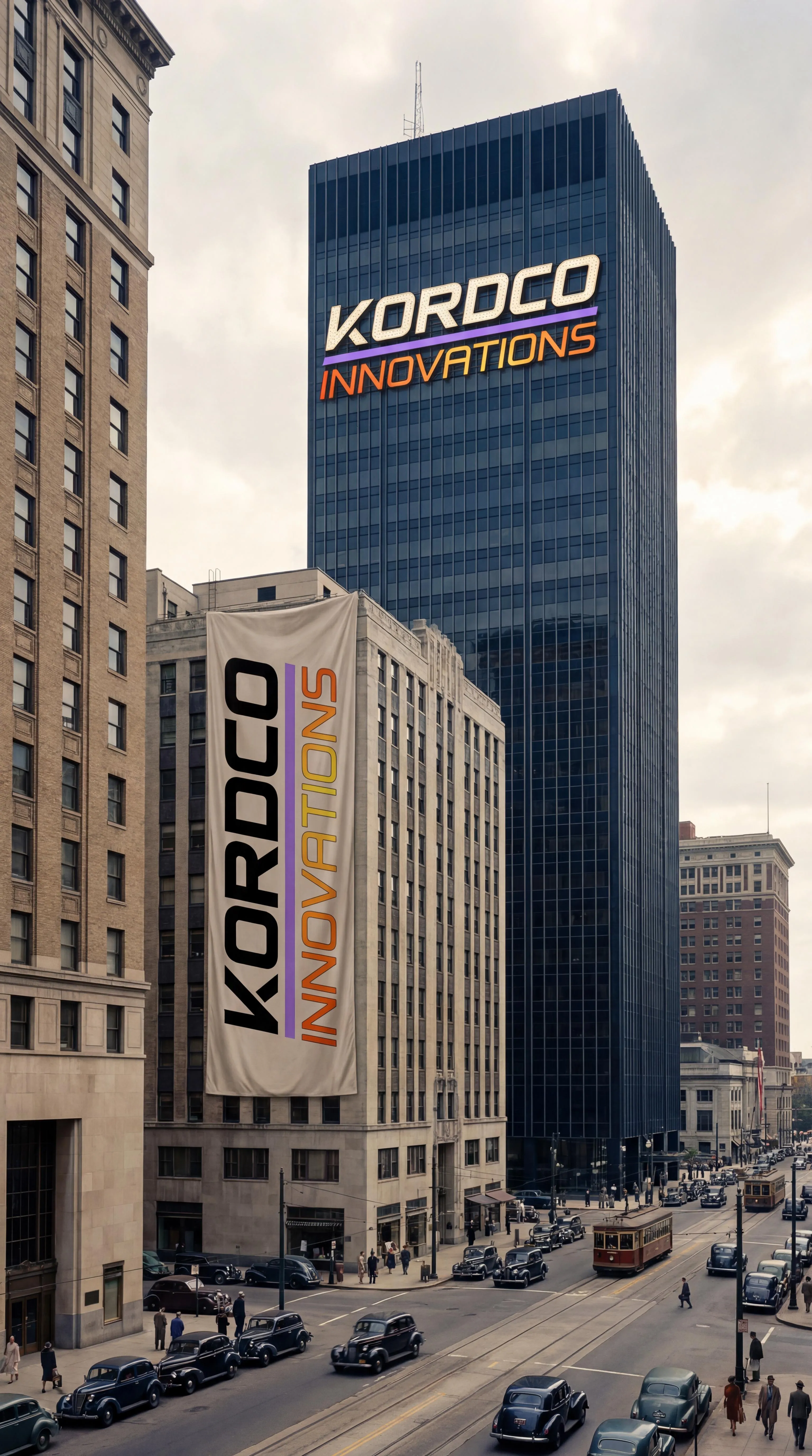 Transform text into AI-generated concept art: See the retrofitted Kord Tower from Blue Beetle (DCEU) featuring the Kordco Innovations logo in 1940s Metro Atlanta. The adjacent building displays a Kordco banner, while the neighboring LexCorp structure stands blank. Create unique cinematic scenes with vivago.ai.