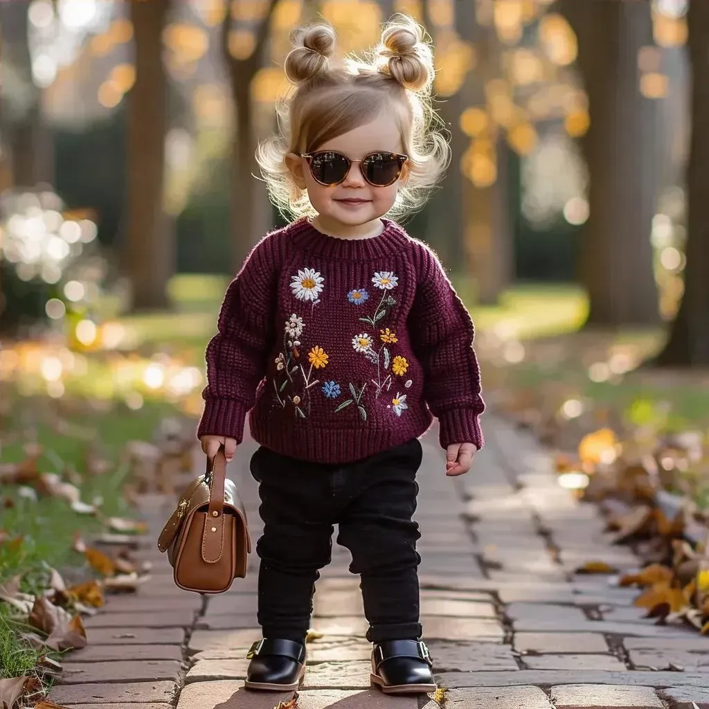 Create a charming AI-generated image of a trendy toddler in a maroon floral sweater, black pants, and sunglasses, sporting blonde hair buns. She carries a brown purse while walking a brick pathway amid lush greenery. Perfect for vibrant, playful visuals with Vivago.ai's AI image tools.