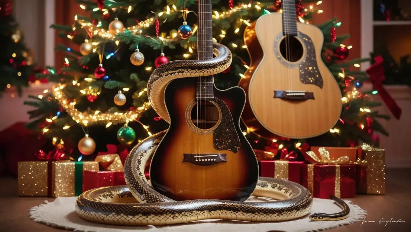 Generate a whimsical AI image of a snake playing guitar under a festive New Year tree, blending surreal holiday charm with creative visuals. Use vivago.ai's AI art generator to craft unique, eye-catching scenes from text prompts. Perfect for surreal digital art, holiday-themed content, and imaginative AI-powered storytelling.