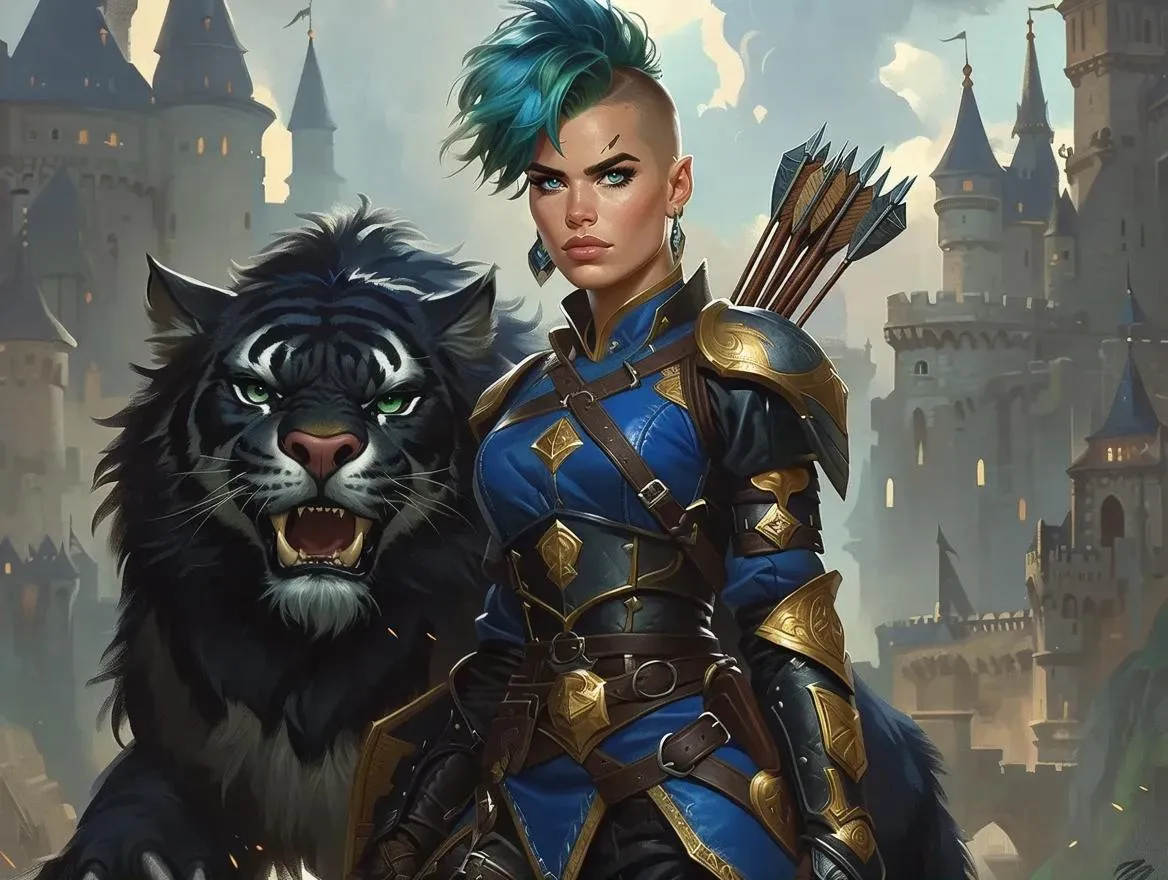 Hyperrealistic ink painting of a steampunk dwarf ranger atop a colossal diretiger, clad in blue-black armor with a green mohawk, wielding crossbow and axes. Gothic architecture, medieval castle, and mystical forests frame this dark, surreal panorama. Game-style details, crepuscular lighting, and a rich, ominous palette blur reality and fantasy in this mystic steampunk adventure scene.