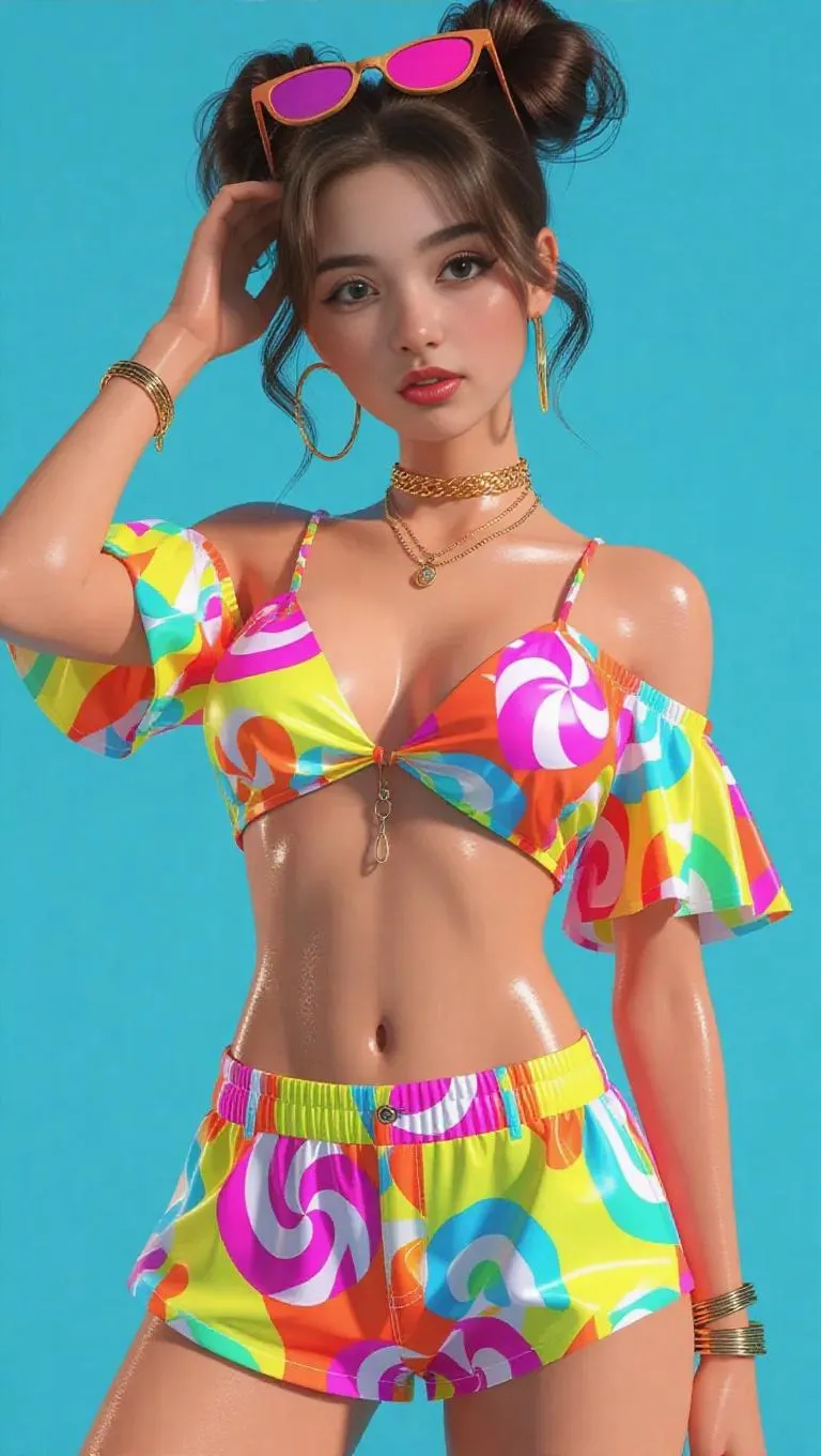 Unlock stunning realistic 3D cartoon style fashion illustration. Generate a girl in vibrant candycolor summer clothing, full-body POP-Mart portrait with neon realism. Get glossy, delicate 8K OC character renderings on clean backgrounds using AI-powered design tools. Perfect for trendy pop art and digital fashion concepts.