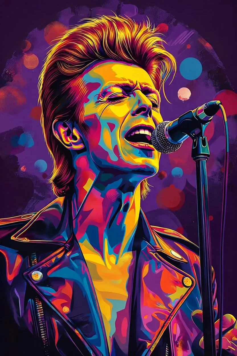Create vibrant AI-generated vector art and pop art designs with Vivago.ai. Transform prompts into award-winning 60s rock-inspired illustrations. Featuring David Bowie in bold silkscreen style on dark purple, this full-length shot merges retro aesthetics with modern AI tools for eye-catching screen-print visuals. Perfect for dynamic, colorful professional artwork.