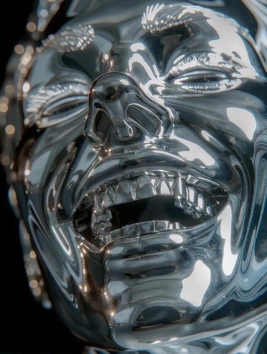 Generate hyperreal metallic human faces with eerie, statuesque beauty using AI. Create uncanny valley sci-fi horror visuals featuring reflective silver textures, sealed eyes, and stark lighting. Perfect for professional-grade AI art blending sculpture, futurism, and unsettling allure.