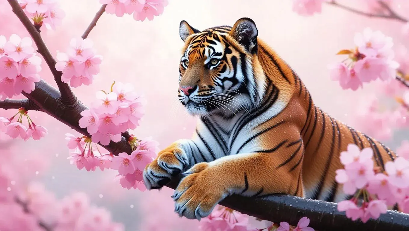 Digital watercolor illustration of a beautiful colorful tigress sitting on a cherry blossom tree in the morning light, dew drops glistening on delicate petals, inspired by Waterhouse, Carne Griffiths, Minjae Lee, Ana Paula Hoppe, intricate and complex contrast, HDR, sharp yet soft cinematic volumetric lighting, flowery pastel colors, wide long shot, perfect masterpiece