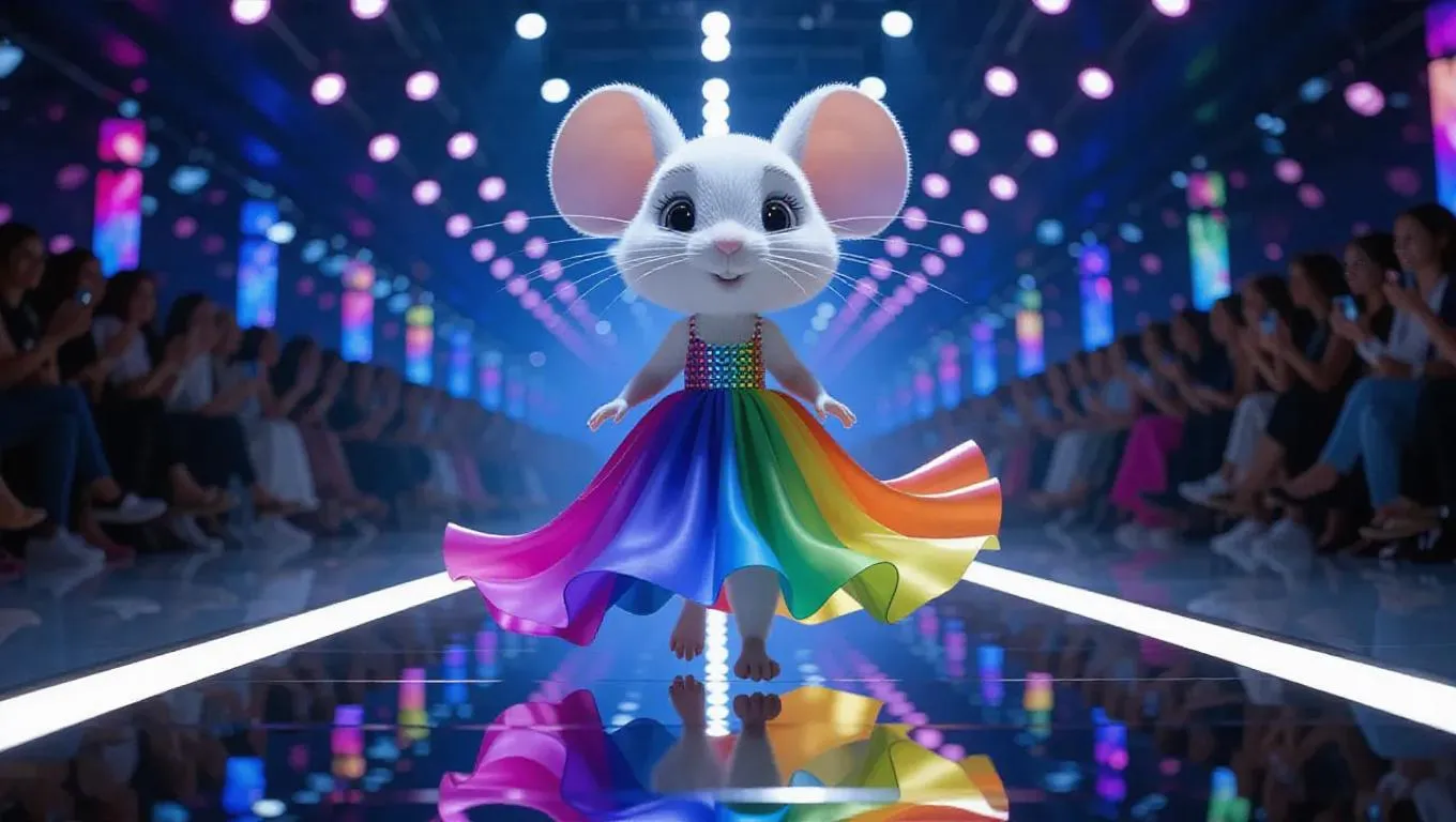 Generate a whimsical cartoon mouse in a vibrant runway scene with AI animation. Vivago.ai crafts ultra-detailed 3D characters, dynamic angles, and flowing rainbow silk dresses. Transform text prompts into professional-grade visuals with lifelike fur textures, mirrored floors, and immersive lighting for creative projects or fashion-inspired digital art.