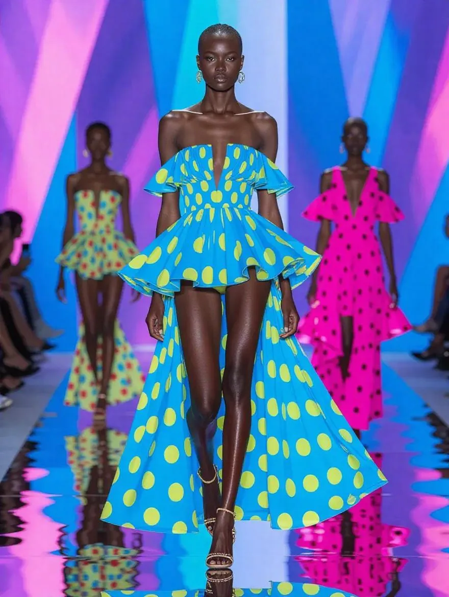 Vivago AI creates Summer 2026 runway looks: bold, playful with flowing silhouettes & sculptural sheer tailoring. Features SS26 Pantone Electric Fuchsia, Transformative Teal, Jelly Mint, Blue Aura, Amber Haze. Oversized translucent polka dots mixed with ombre gradients. Neon accents and organic textures bring nostalgic yet futuristic energy. AI-generated fashion vision.