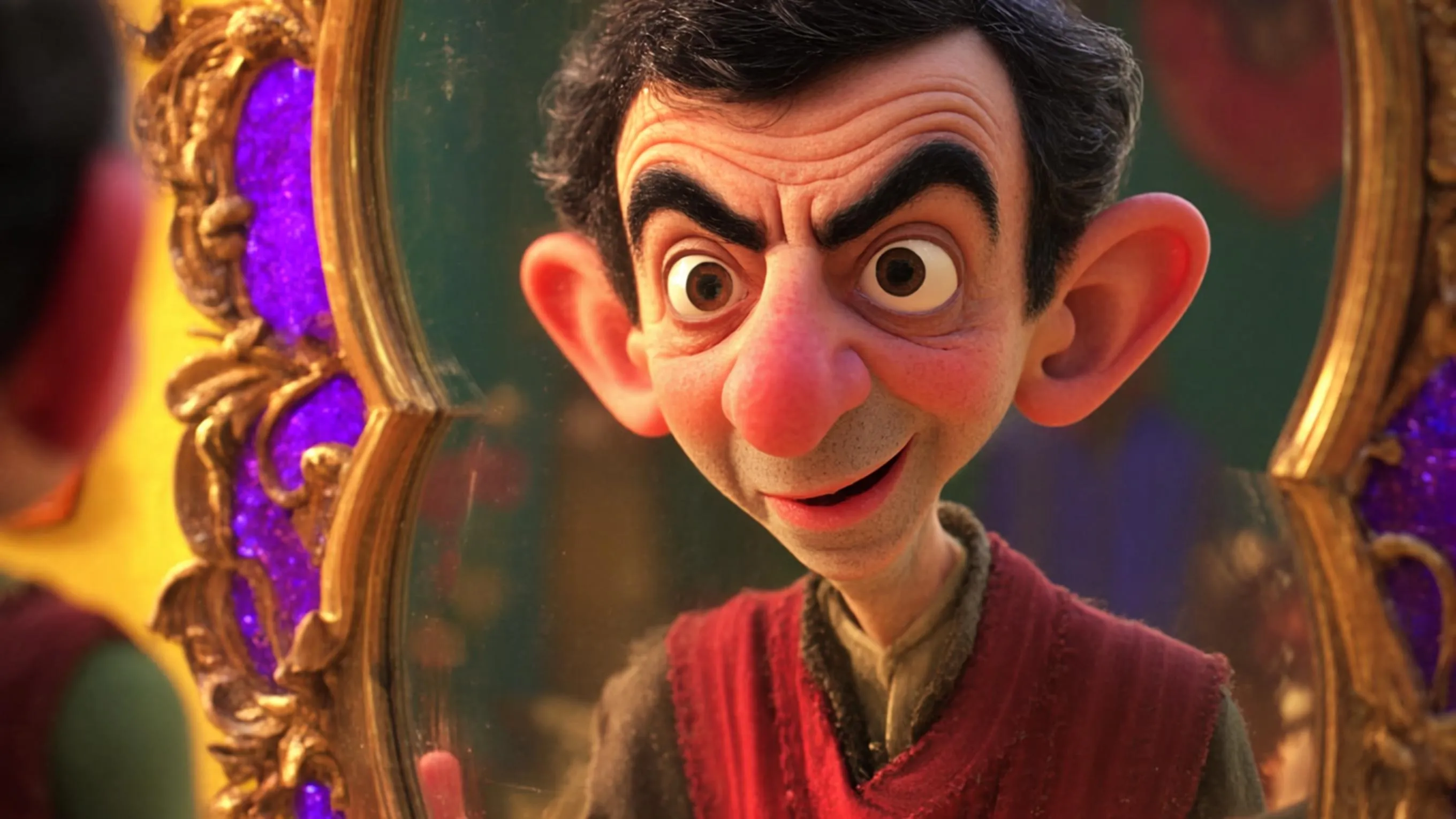 A low-angle, slow-motion dolly shot of a lone figure standing in the center of a dimly lit, eerie carnival at dusk, the only sound being the distant, haunting calliope music. The man, dressed in a worn, 19th-century three-piece suit, has a rabbit's head, with long, silky whiskers and glassy, black eyes that seem to hold a deep sadness. His ears, long and perked, twitch slightly as he gazes upwards, lost in thought. In the background, dilapidated booths and rickety Ferris wheels loom, shrouded in mist, while the air is thick with the sweet scent of funnel cakes and the promise of forgotten dreams. The camera glides closer, the man's rabbit features illuminated by the faint, golden light of a lone, flickering lantern, as if spotlighting a forgotten mythical creature in a world that's left him behind.