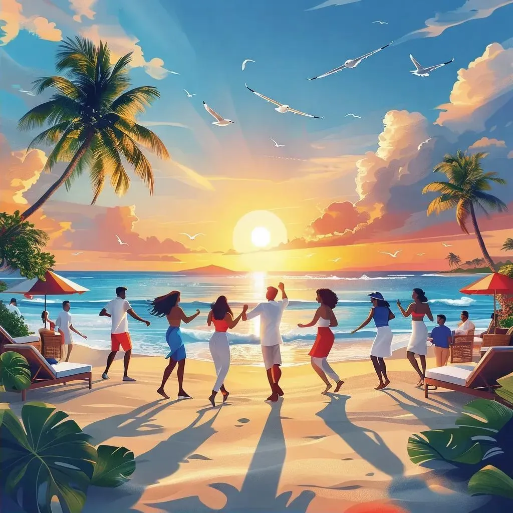 Generate vibrant AI motion designs of Caribbean dancers in white, blue, and red, set against a golden-hour tropical beach. Modern minimalist style highlights sun loungers, seagulls, a distant plane, and lush vegetation. Ideal for dynamic, professional visuals with vivago.ai's AI-powered tools for seamless text-to-video and creative effects.