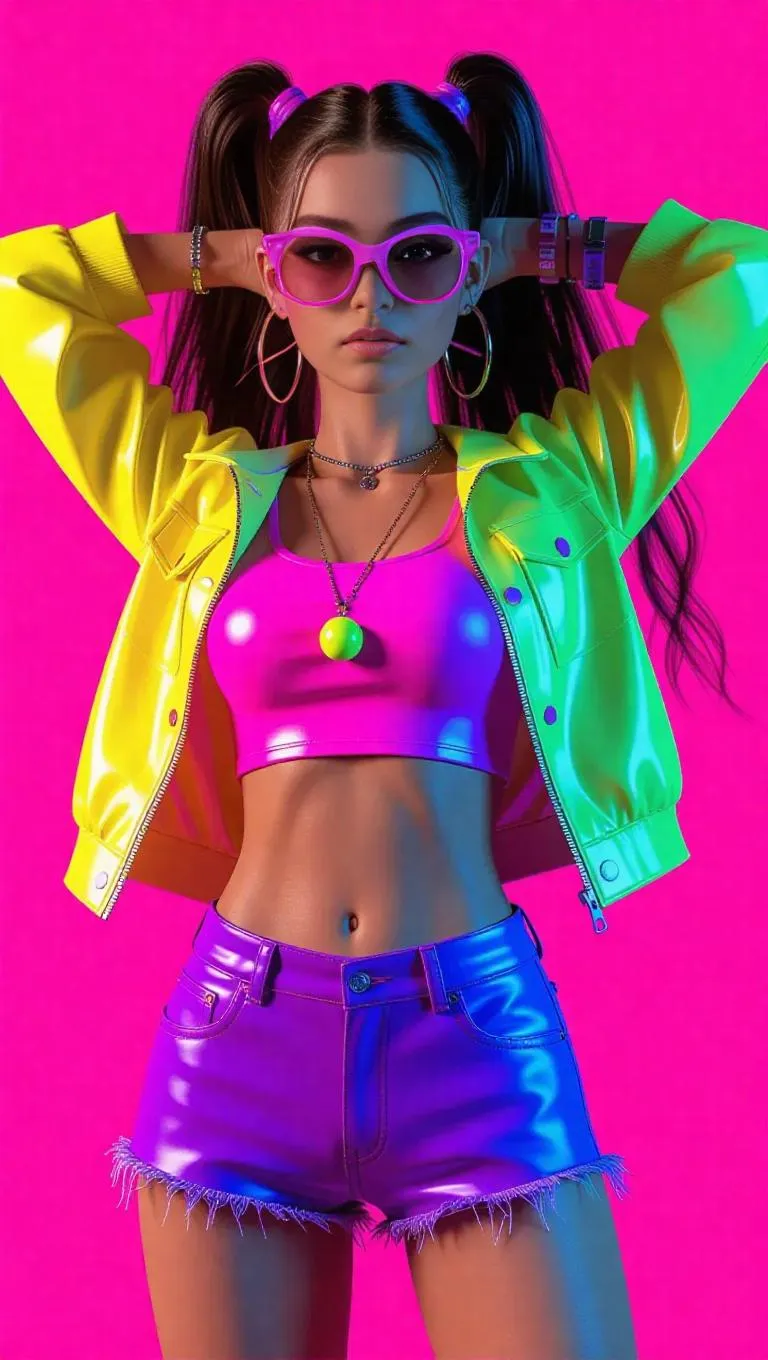 Unlock stunning realistic 3D cartoon style fashion illustration. Generate a girl in vibrant candycolor summer clothing, full-body POP-Mart portrait with neon realism. Get glossy, delicate 8K OC character renderings on clean backgrounds using AI-powered design tools. Perfect for trendy pop art and digital fashion concepts.