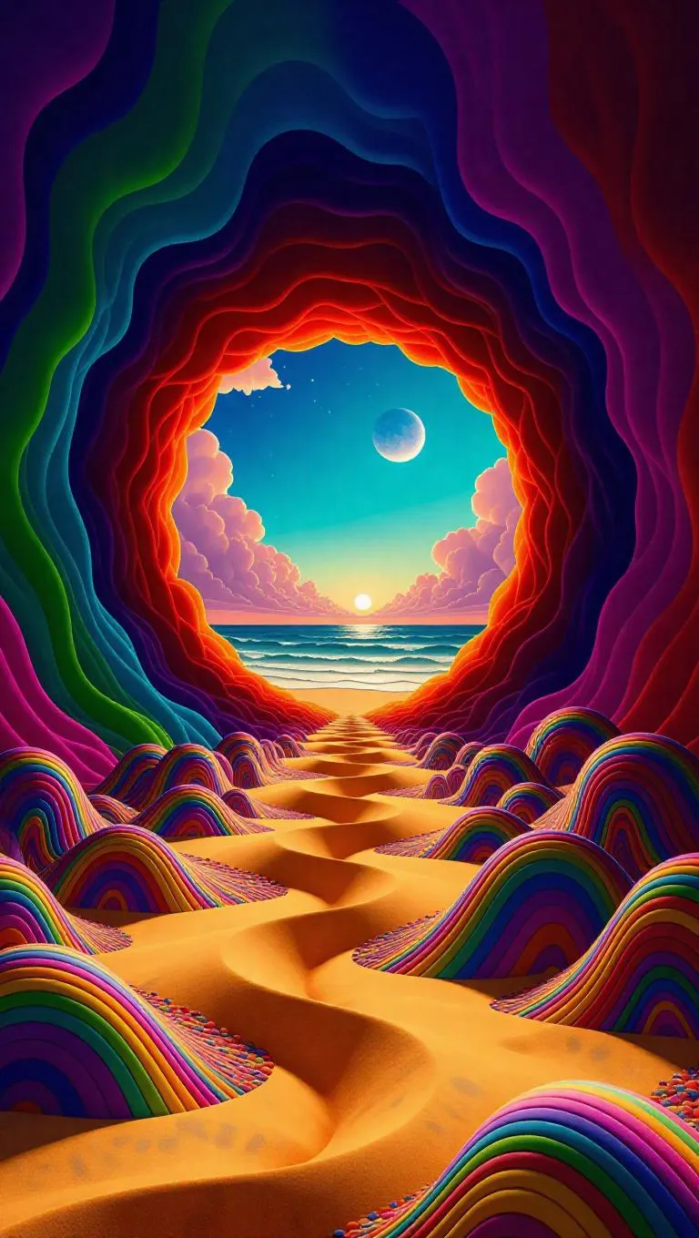 Vivid psychedelic AI art with liquid cartoon effects, surreal cosmic rivers, and Persian carpet details. Transform prompts into vibrant, abstract landscapes where skies peel to reveal nature's Eden. Eric Carle-inspired textures meet liquid light flowing from celestial holes—crafted by AI for dynamic, surreal visuals in Earthly gardens or cosmic beaches. Explore limitless creativity with Vivago.ai's AI image generator.