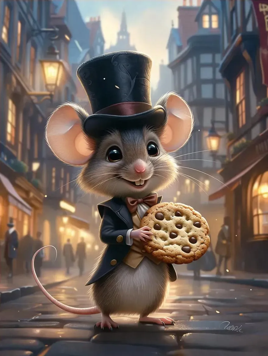Generate a hyperrealistic mouse with shiny hair, holding a big cookie and wearing a high English hat on bustling streets. AI-powered movie texture and hi-fi quality bring this 16k resolution vector art/cartoon to life. Explore professional editing tools and AI effects for stunning visuals with VivaGo.ai.