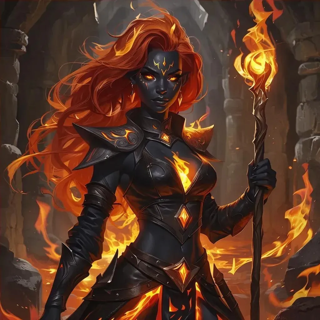 Create a striking Female Fire Genasi with fiery red flame-like hair, glowing ember eyes, and charcoal skin illuminated by radiant red highlights. Generate AI-powered fantasy art featuring a singed staff and burnt leather robes, perfect for Dungeons & Dragons character design. Transform text prompts into vivid visuals with VivaGo.ai's professional editing tools.