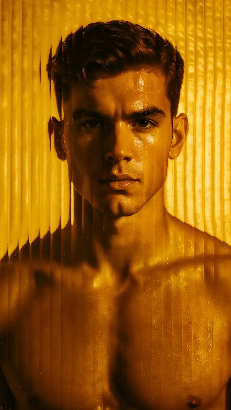 Surreal AI portrait of a muscular male behind ribbed glass, distorted face with abstract waves. Cinematic gold lighting, vivid yellow backdrop, and high-contrast saturation create mysterious, emotional visuals. Explore AI-generated artistic effects for dramatic, abstract compositions with Vivago.ai's image tools.