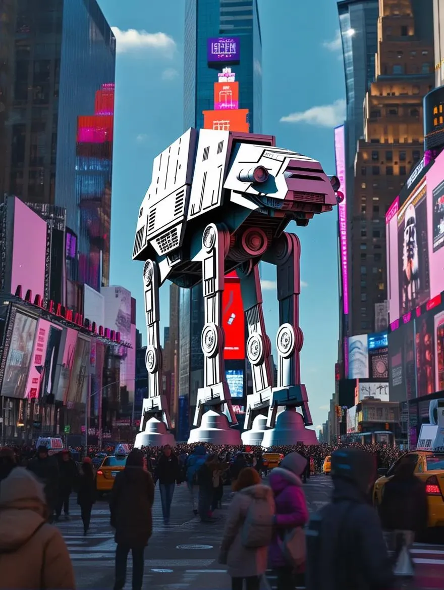 AI-generated Imperial Walker AT-AT strides through Times Square NYC traffic in ultra-high resolution. Experience vivid texture mapping and cinematic detail on a bright day. Transform text prompts into epic AI visuals with VivaGo.ai’s creative tools for professional-grade, hyper-realistic imagery.