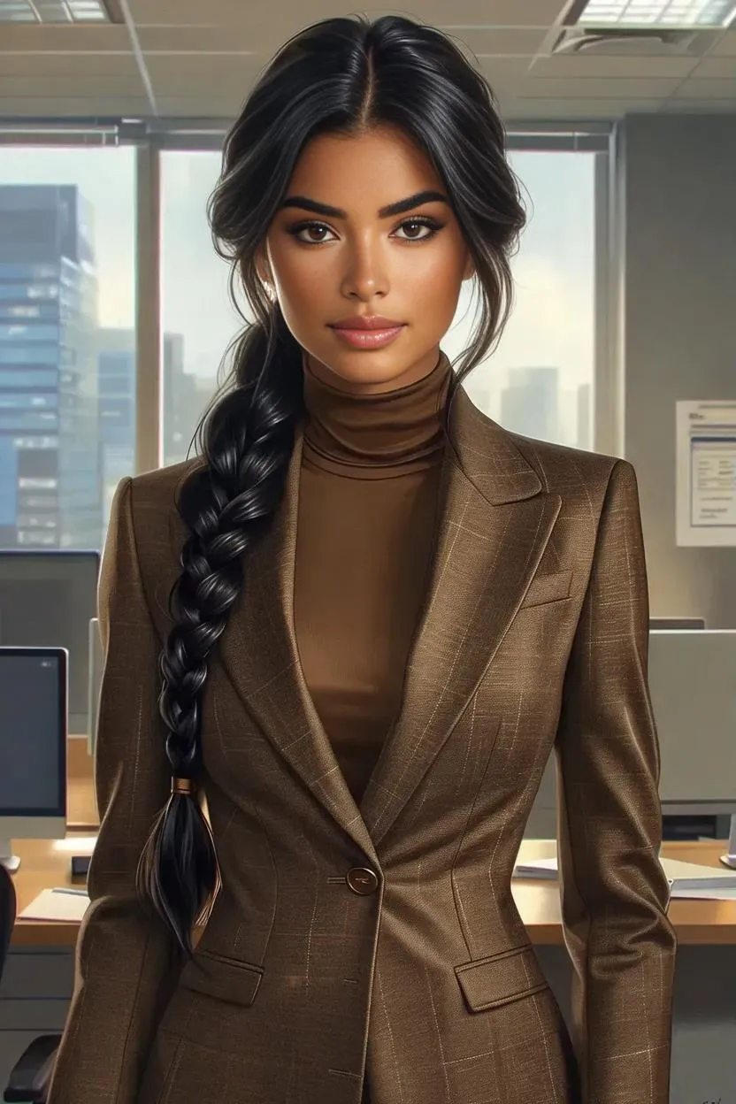 Create high-resolution AI-generated art of a Latina woman in a brown turtleneck, featuring intricate braided hair, tan skin, and amber eyes. Transform prompts into 8K digital paintings with soft lighting, modern office backdrops, and professional editing tools for striking, detailed visual content.