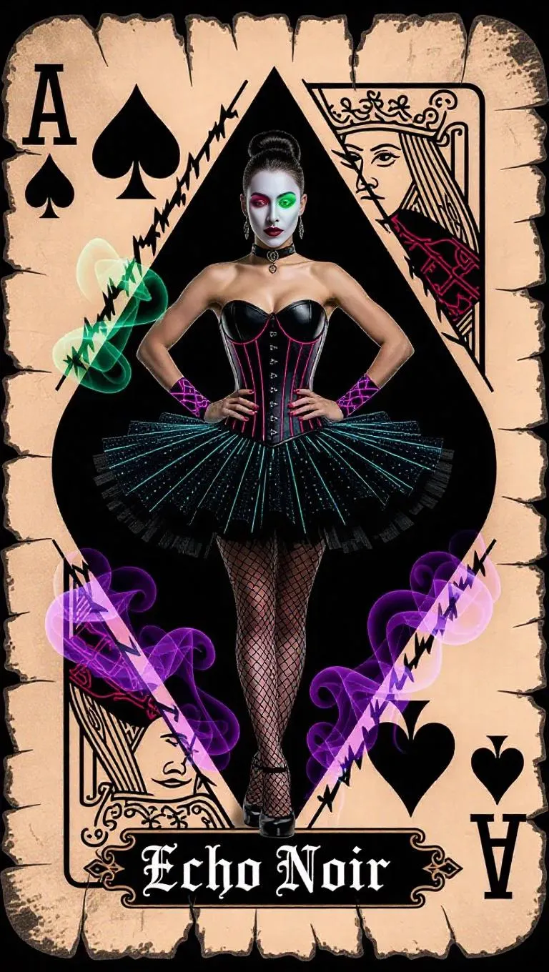 A full-length female figure standing in a hip-hop dance pose, framed within a cracked noir-style playing card for a joker or ace. Gothic corset fused with glowing circuit veins, shimmering black skirt made of shadows and data fog. Comic book joker color makeup, eyes shimmer red and green. Translucent card frame with ink butterflies and jagged code. Nameplate "Echo Noir" in gothic style at the bottom. Smoke and light trails shimmer around her feet, frozen dance aura.