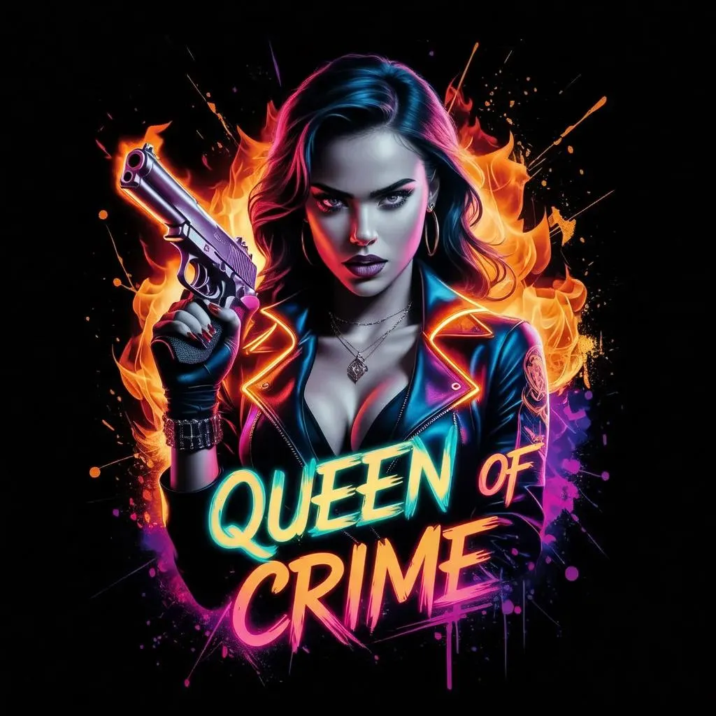 Create a fierce mafia girl design with glowing neon accents, detailed portrait, and a blazing fire backdrop. Features vibrant red, orange, and purple hues, grunge textures, ink splatters, and bold "Queen of Crime" text. AI-generated fluorescence effects enhance realism on a stark black background. Perfect for vivid, intense apparel graphics.