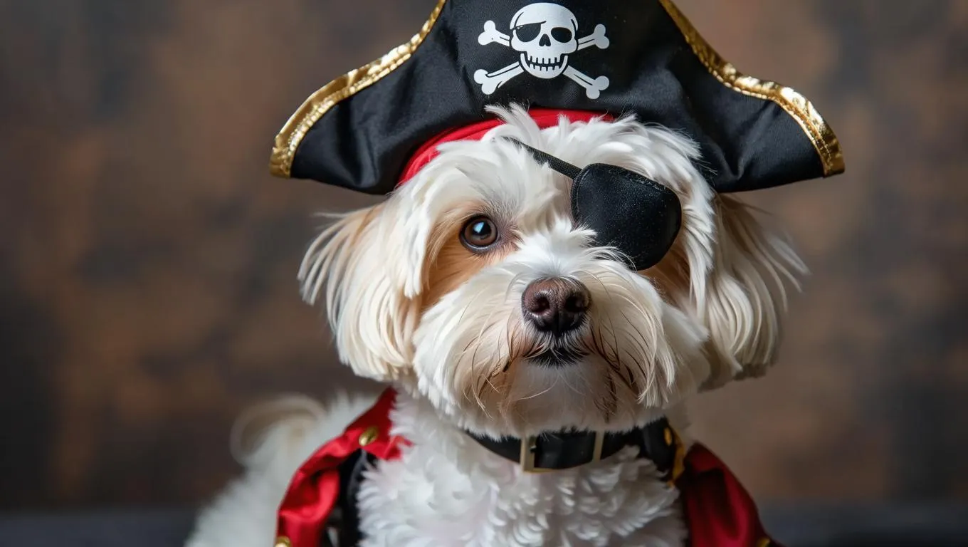 Create a playful AI-generated image of a Maltese dog dressed as a pirate with an eyepatch, treasure chest, and ocean backdrop. Explore vivago.ai's AI effects for unique pet transformations, pirate-themed visuals, and text-to-image generation tools for professional-grade, creative content.