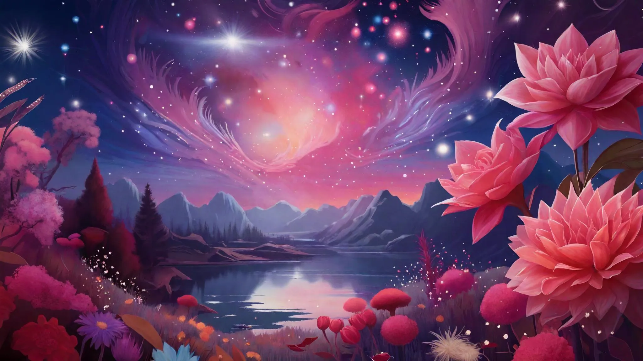 Generate enchanting AI art with vivid starry night skies, neon floral fields, and mystical reflective waters. vivago.ai transforms prompts into surreal fantasy landscapes using AI effects—craft nebula-draped horizons, intricate botanicals, and cosmic depths effortlessly. Ideal for dreamlike digital visuals, ethereal scenery, and celestial-inspired creations. Transform text into mesmerizing visuals with vivago.ai's AI tools for professional-grade fantasy landscapes.